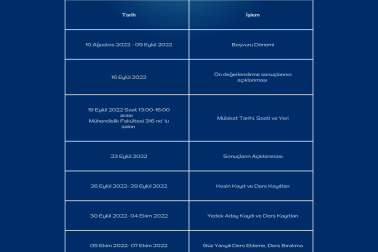 19 Eylül 2022 Saat 13:00-16:00 arası Mühendislik Fakültesi 316 no’ lu salon |