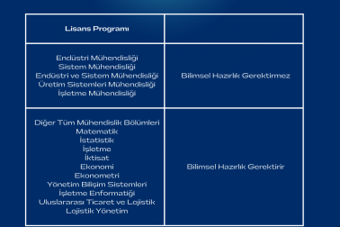 Diğer Tüm Mühendislik Bölümleri Matematik İstatistik İşletme İktisat Ekonomi Ekonometri Yönetim Bilişim Sistemleri İşletme Enformatiği Uluslararası Ticaret ve Lojistik Lojistik Yönetimi |