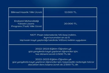 2022-2023 Eğitim-Öğretim yılı güz yarıyılında kayıt yaptıran öğrenciler için; tez dönemi ücreti 2.500 TL'dir. 2022-2023 Eğitim-Öğretim yılı güz yarıyılında kayıt yaptıran öğrenciler için; başarısızlık nedeniyle tekrar alacakları ders başına ücret de 2.500 TL’dir. |