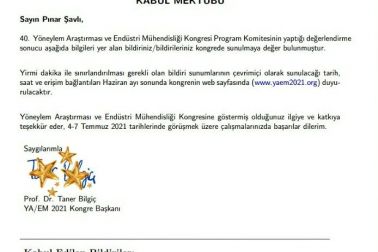 Bölümümüz öğrencilerinden Pınar Şavlı, Ahsen Korkmazer ve Gökçe Gül Gökçeoğlu' nun Bitirme Projesi kapsamında Akademik Danışmanları Prof. Dr. Erkan Köse ile hazırlamış oldukları "Pandemi Döneminde Servis Araçları Rota Optimizasyonu" başlıklı bildirileri 40. Yöneylem Araştırması ve Endüstri Mühendisliği Kongresi 'nde sunulmaya değer bulmuştur. Öğrencilerimizi tebrik ederiz.