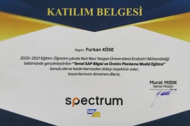 Endüstri Mühendislerini iş bulma süreçlerinde avantajlı konuma getirecek SAP-Kurumsal Kaynak Planlama eğitimini başarıyla tamamlayan öğrencilerimize Spectrum Bilişim tarafından düzenlenen katılım sertifikaları ulaştırılmıştır.