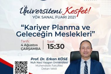 Nuh Naci Yazgan Üniversitesi Mühendislik Fakültesi Dekanı Prof.Dr. Erkan Köse, 4 Ağustos 2021|Çarşamba Saat:15:30' da 2021 YÖK Sanal Fuarında "Kariyer Planlama ve Geleceğin Meslekleri"ni tanıtıp bilgilendireceği Online Konferans'ta sizlerle birlikte olacak.